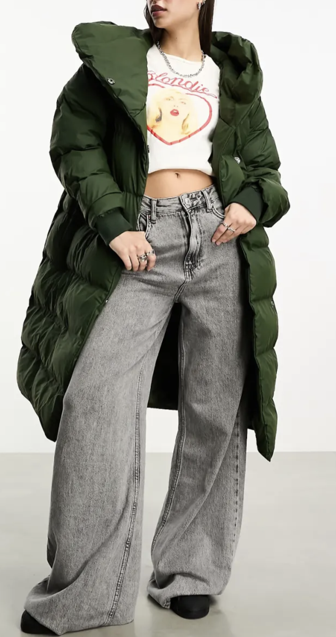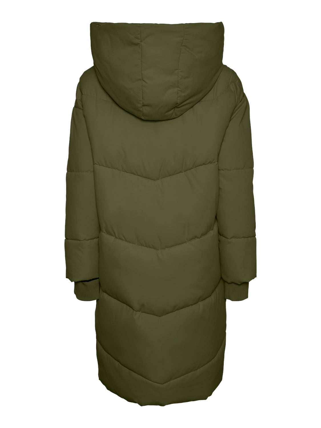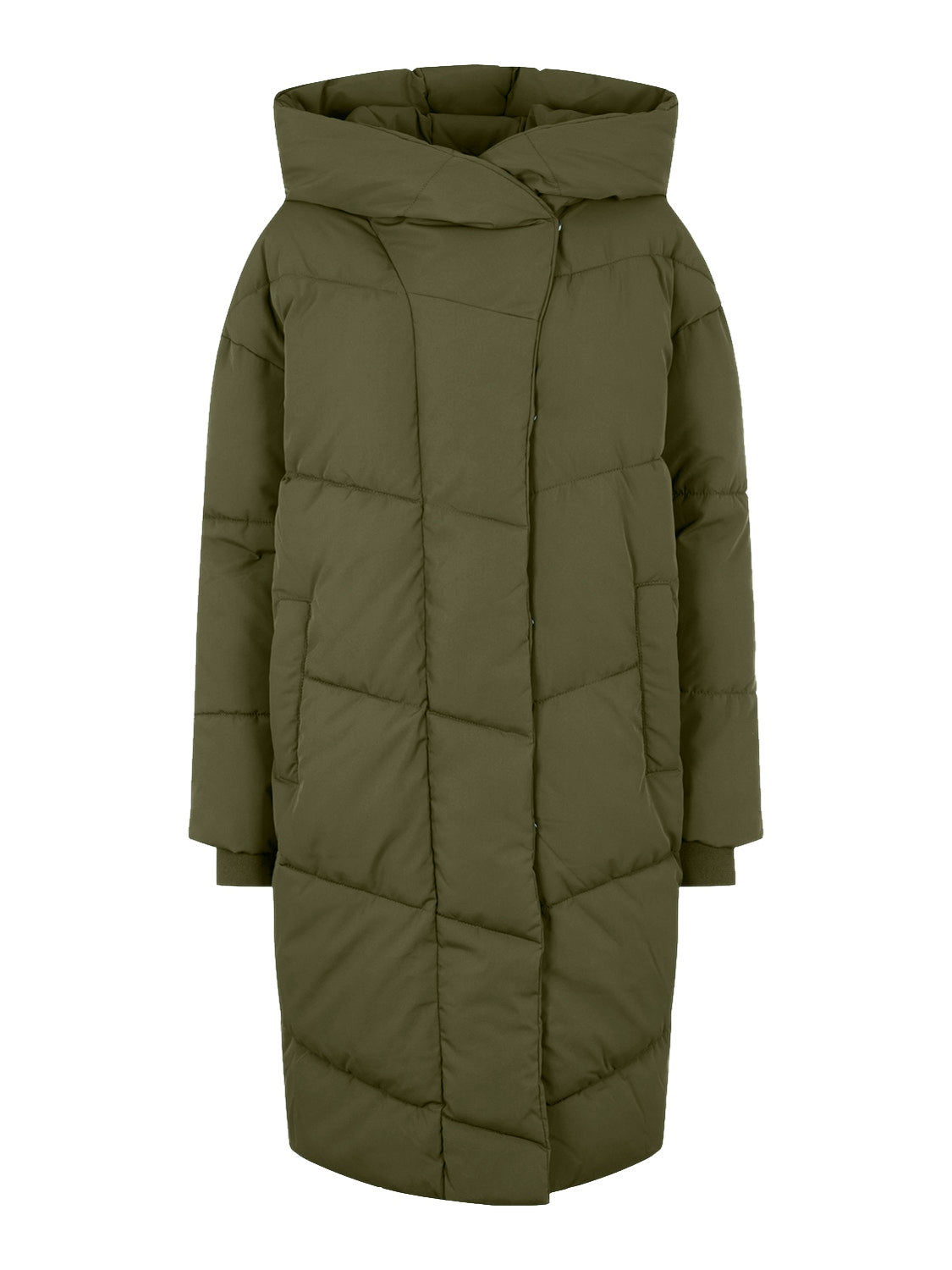 Khaki green long puffa jacket.