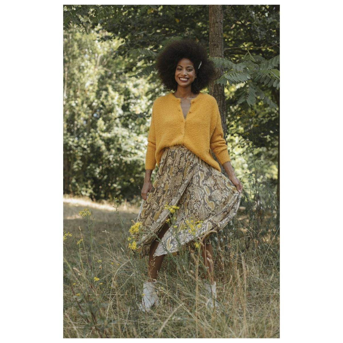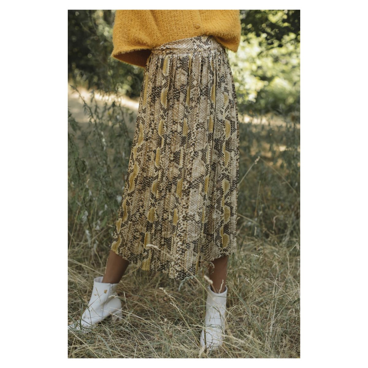 - Pleated midi skirt in snake print.